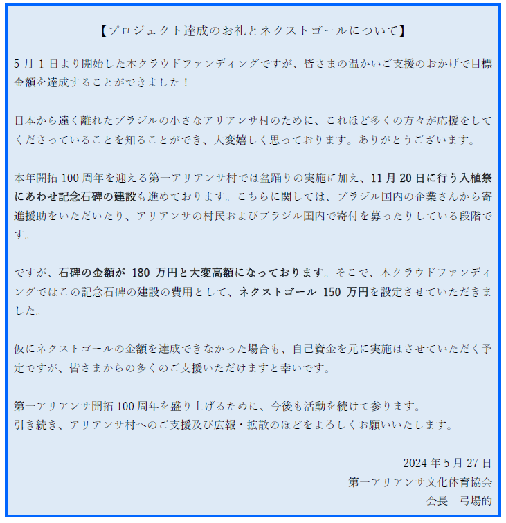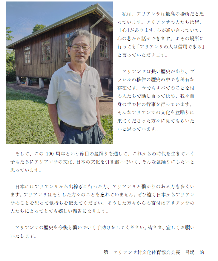 今いる第一アリアンサ村の皆さん、そして今もこうして素晴らしい人と風土と文化と人が残る第一アリアンサ村を築き上げてくださった先人の方々のためにも、皆様のお力をどうぞお貸しください。宜しくお願いいたします。