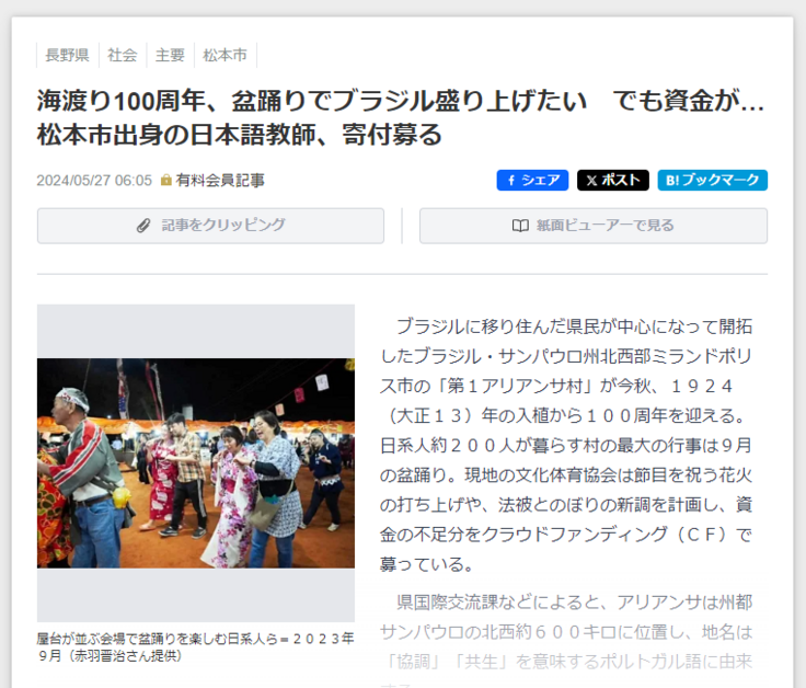 長野県の方々に、アリアンサ開拓100年およびアリアンサの盆踊りに知っていただけるのが嬉しいです。