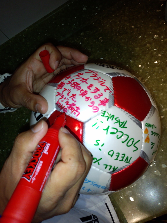 ストリートチルドレンにメッセージを送ろうと、ブラジル国旗、日本国内で集めたサッカーボール(新品)に寄せ書きを集めました。