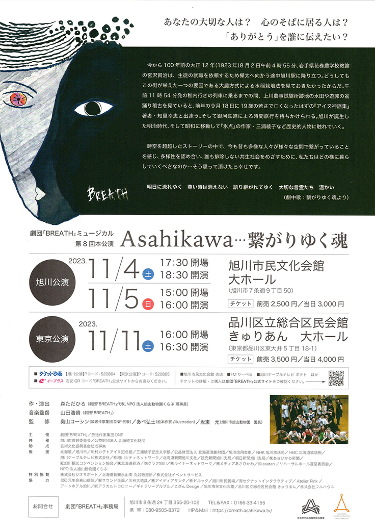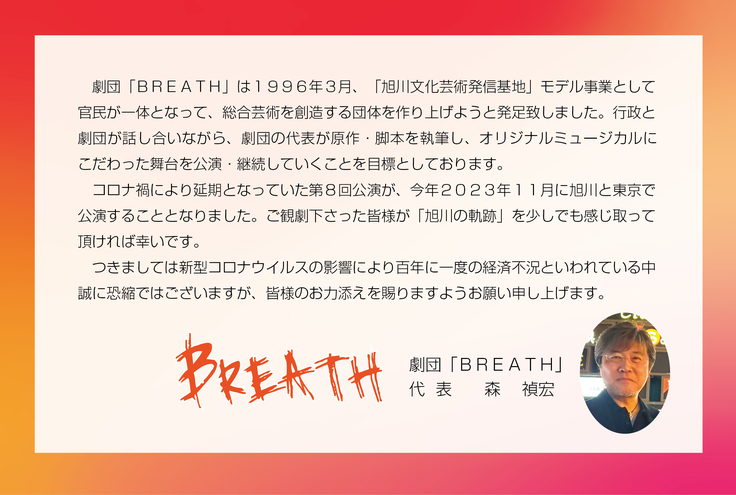 平成8年、官民一体型モデル団体の「BREATH」は『この街に自分達の手で彩(いろ)をつけていきたい』という想いを行政・民間が一体となり、音楽の街・旭川に見合うミュージカル(総合芸術)を完全オリジナルで創り上げることを目標に旭川市と近郊8町の有志によって『生きる喜び』をテーマに発足致しました。