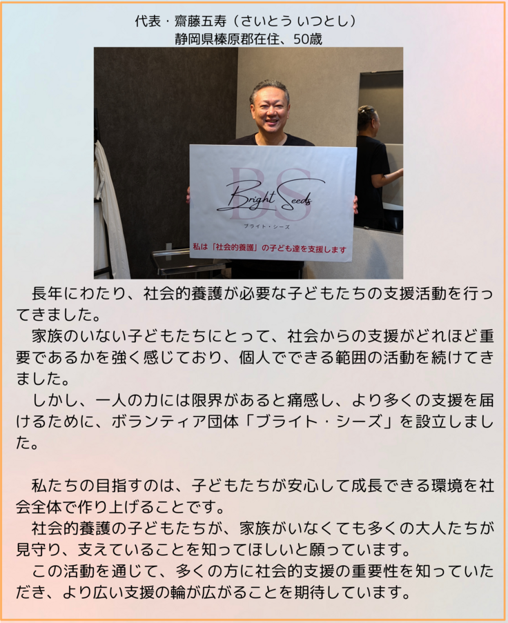 私は美容師として30年以上のキャリアを持つ傍ら、社会的養護の子どもたちへのボランティア活動としてヘアカットを続けてきました。施設を訪問する中で、子どもたちの笑顔に触れ、より多くの支援の必要性を感じるようになりました。 地域の農家の人々と連携し、季節の農作物を施設に届ける活動も展開。支援の輪が少しずつ進んで手を携えて感じられ、もっと組織的な支援ができないかと考えられました。 そこで2024年、支援団体「ブライト・シーズ」を設立。 「子どもたちの未来に、より多くの可能性の種を蒔きたい」という思いのもと、さまざまな分野の人々と協力しながら、子どもたちの未来を支える活動を始めました。