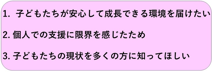 これまでは個人での支援や少人数での活動を続けてきましたが、子どもたち一人ひとりのニーズに応えるには限界があると痛感しました。多くの方々と共に支援の輪を広げることで、より多くの子どもたちに必要な支援を届けられると信じ、このプロジェクトを立ち上げました。
