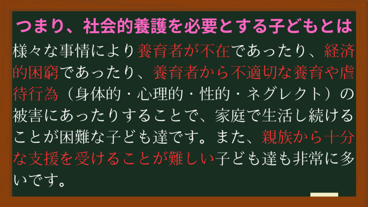 彼らは日々の生活を支えられていますが、通常家庭の子どもたちが経験する温かな家庭生活や親からの愛情、日常的なサポートが不足していることが多いのが現状です。