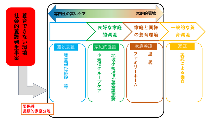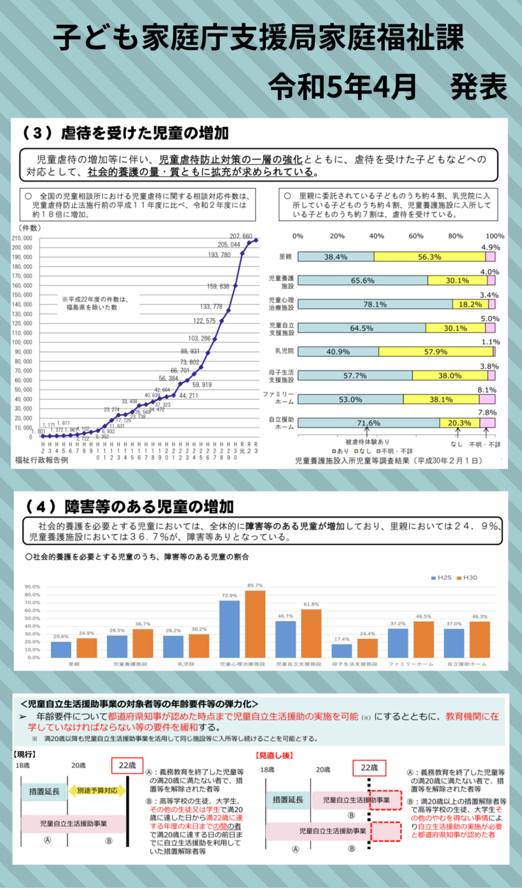 社会的養護を必要とする子ども達は、不適切な養育、虐待行為(身体的・心理的・性的・ネグレクト)、生活困窮など、様々な事情により、家庭での生活を続けることが困難であり、児童福祉施設や里親宅で生活をしています。
