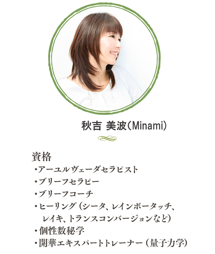 秋吉 美波(Minami)です。 ココロとカラダのセラピストとして活動しております。 心理学、ヒーリング、ボディートリートメントを学んできた経験を活かし、 『心と体にアプローチして心身共に健康にしてハッピーになる』ということをコンセプトのもとアーユルヴェーダを通してカウンセリング、施術(オイルトリートメント)をしております。 私はシングルマザーで高校生の息子と娘がおります。 以前は女一人では生活もままならないと信じ込んでいて 心身共に疲れ果て、生きにくさを感じていた時期もありましたが 心理学を学び、自分を愛することを知り、自分を大切にすることを知り、 身も心もすっかり軽くなり、とても生きやすく生き生きと生活ができるようになり メンタルセラピストとして活動をするまでになりました。 アーユルヴェーダと出会い、その素晴らしさを少しでも多くの方にお伝えしたい。 そんな風に思ってます