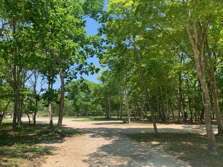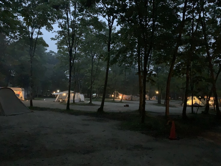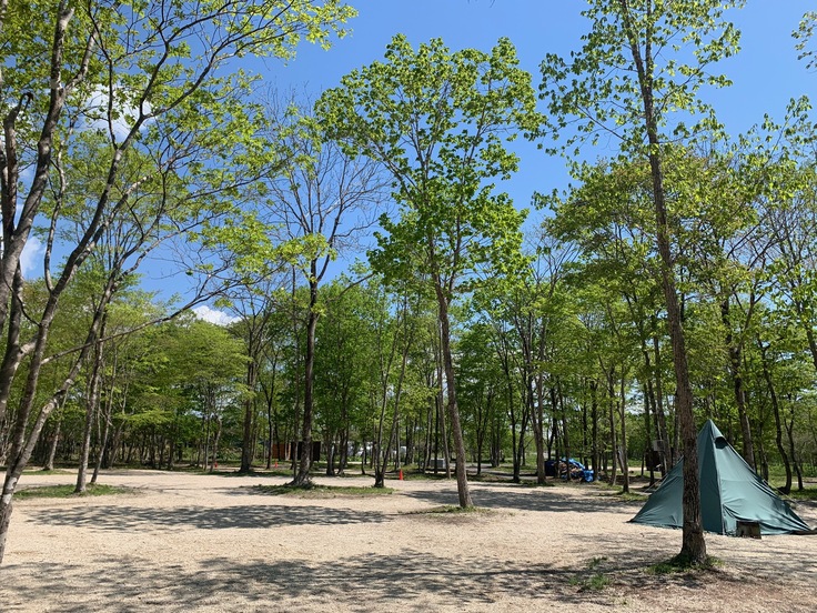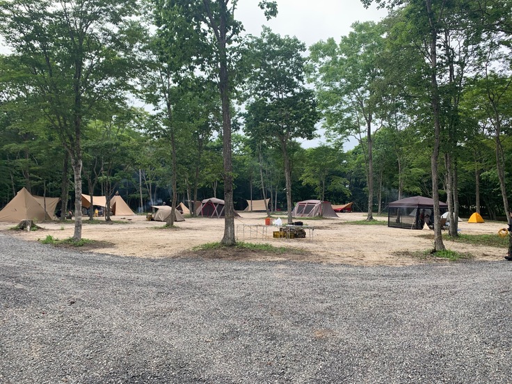キャンプ場はミズナラ等の木々が自生する林間キャンプ場です。深い森の中でテントやハンモックを張れる事が特徴です。木立の中、程よい木漏れ日が心地良く、リラックスできます。サイトの地面は「火山礫」と言って水捌けの良い小さな砂利のようなもの。