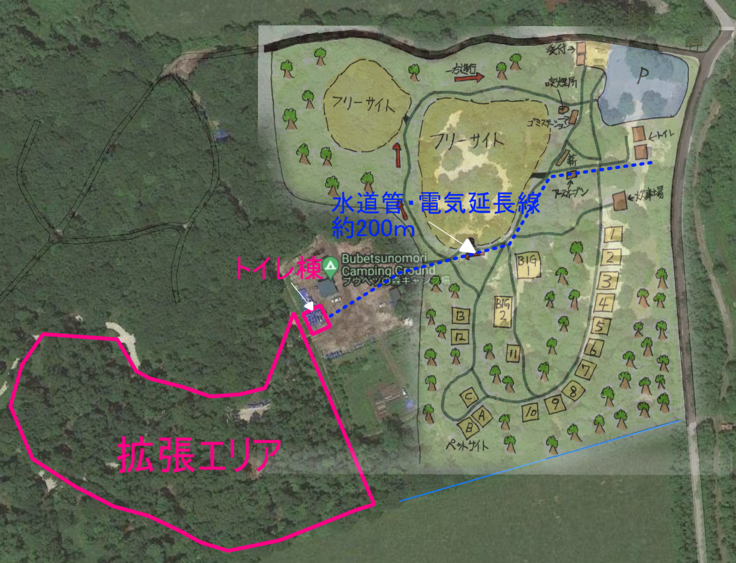 2022年の春以降に既設のキャンプ場から100m程離れた箇所に車ごと利用できるオートサイト20区画程度とフリーサイトを作る予定です。サイトから近い場所にトイレや炊事場がある事、これがキャンプを快適に過ごしていただく重要なポイントの一つです。そのために必要な電気、水道の延長工事、トイレ棟の増設、浄化槽の設備工事を行う事が今回のプロジェクトの目的です。この工事がキャンプ場拡張のために最も費用の掛かる部分となります。