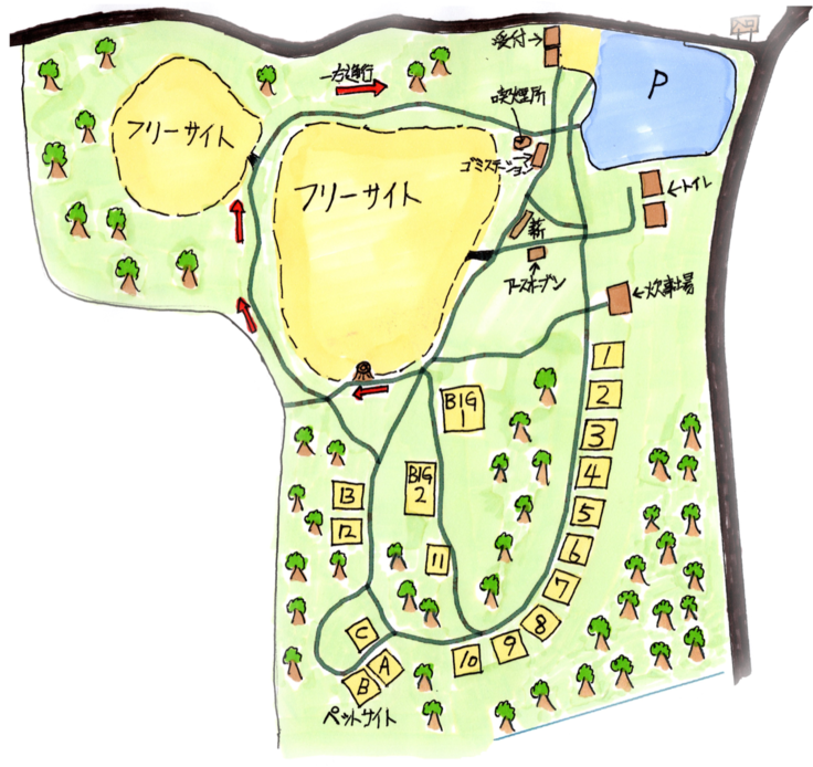 現在の施設は受付小屋一棟、トイレ2棟、炊事場一棟で、フリーサイト30組、オートサイト15区画、ペットサイト3区画となっております。