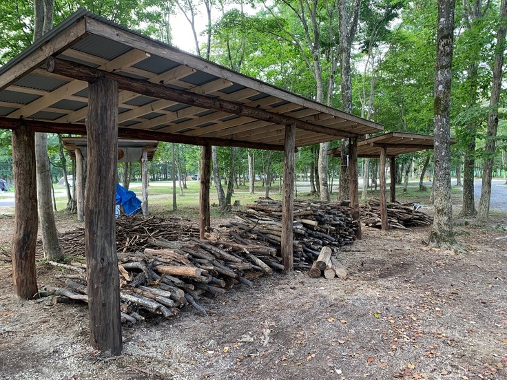 そして、焚火キャンプに嬉しい「無料の薪」も好評です。 林業をしていると林地残材という一般的には山に放置してしまう、細い枝の部分を伐採現場から搔き集めてキャンパーさんにご利用いただいております。林地残材は1m程の長いまま積んであるので、ノコギリで挽いて使っていただいて薪づくりの一手間も楽しんでもらってます。