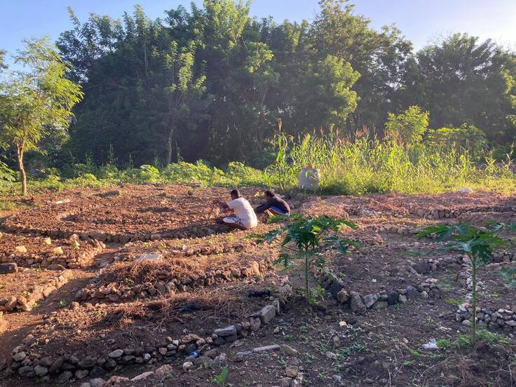 引き続きアロール島の方に指導していただきながら、小さな芽がでた野菜を、肥料を加えて耕した土に植えていく作業をしています。