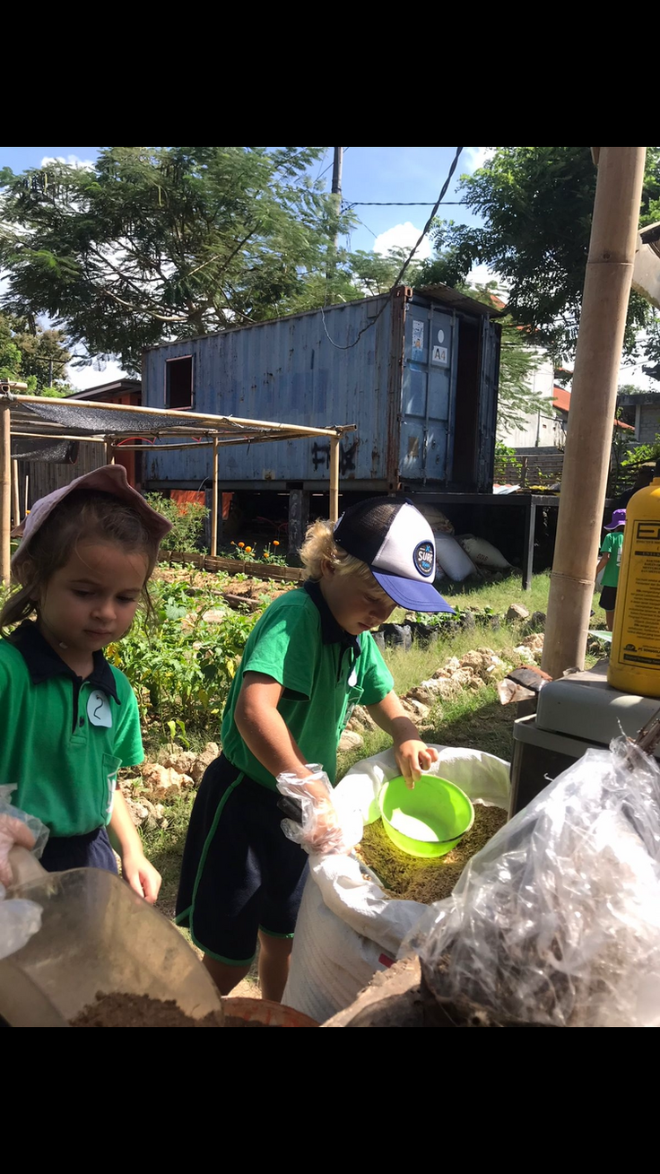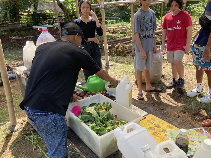原材料の野菜や果物の皮は、市場やレストランから、本来ゴミとして捨てられてしまうものを私たちの畑に無料でいただいています。それと、新鮮な葉っぱなどを使い、ひとりづつボトルに材料を入れて持って帰るのですが、最初は、様々な果物や野菜のにおいに離れて行く子も、、、
