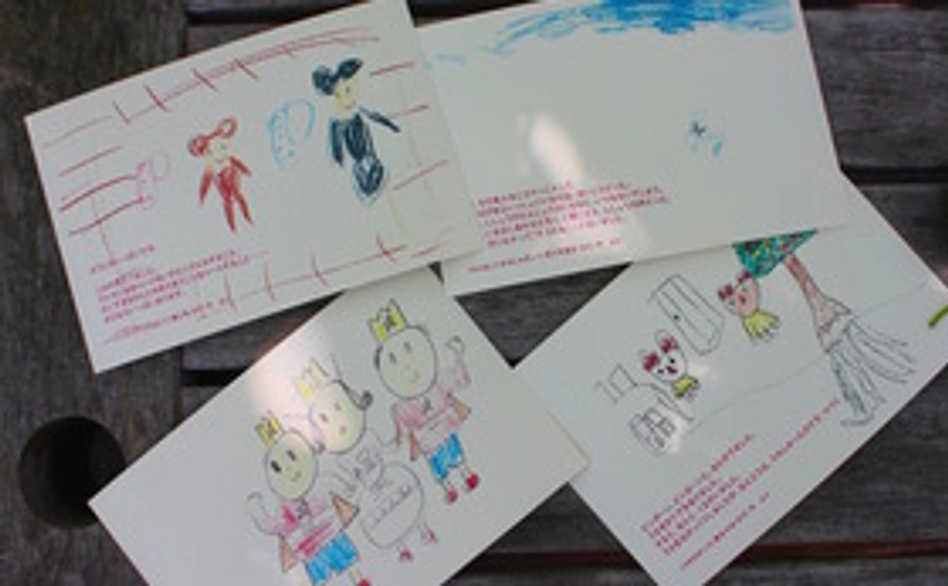 「ぶんぶんの時間」(4か所)でこどもたちがつくった作品から、1か所ごとに作家がおはなしをえらびポストカードをつくりました。