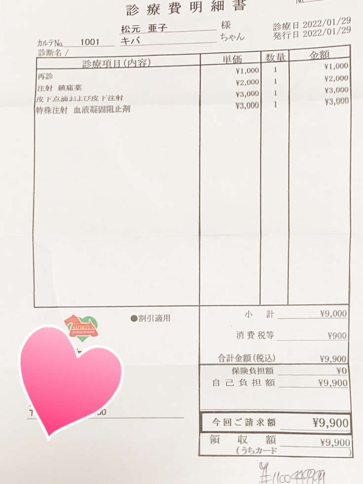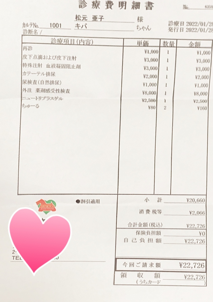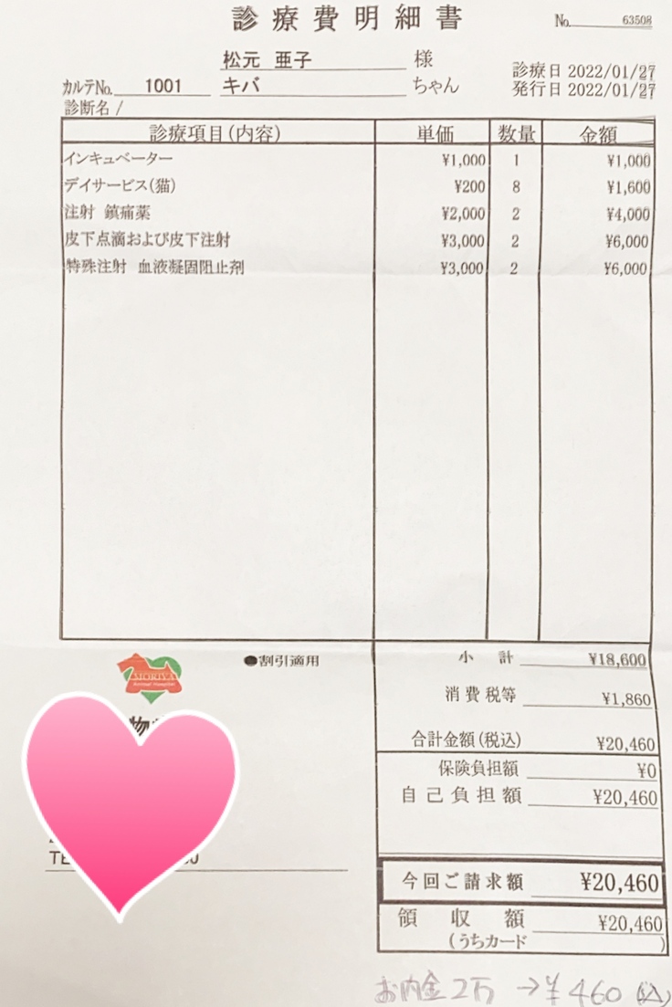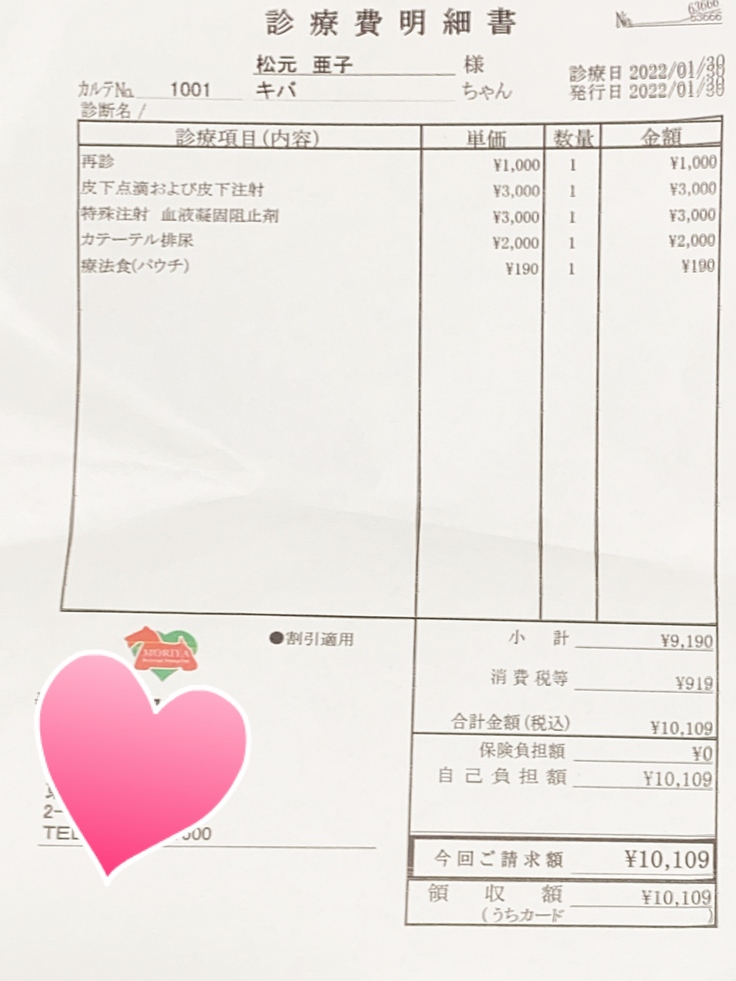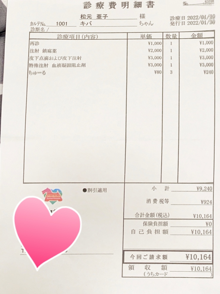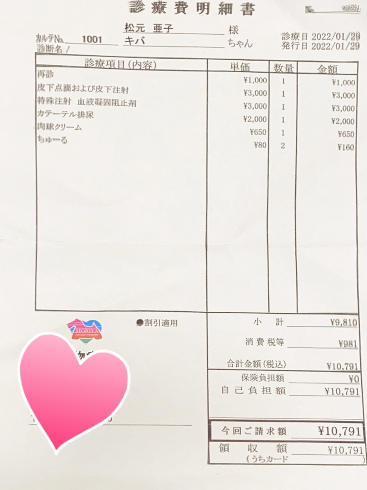 (注射は1日2回に分けて投与しています。そのため、1日2枚の領収書が発生するため少し見づらいかもしれません)
