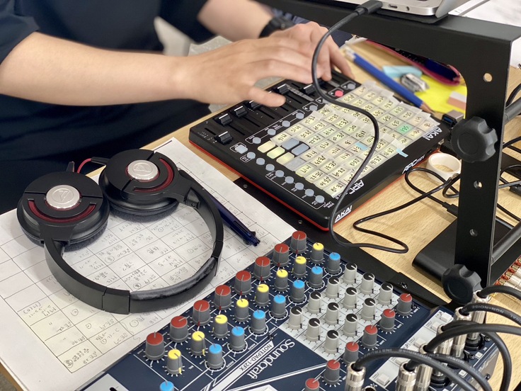 音響のセットもキャリーケースいっぱいに用意して、すごく重たい中もってきて下さいました。稽古に来られるまでにも、おいそがしいなか大急ぎでプランを立ててくださったのです。