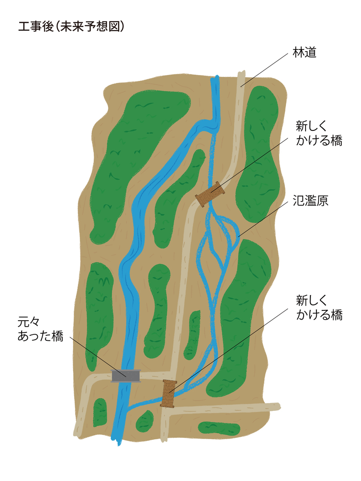 氾濫原を復元するために河川の分岐工事を行い、既存の林道に橋をかける。資金は工事費用および生物調査資金として利用します。