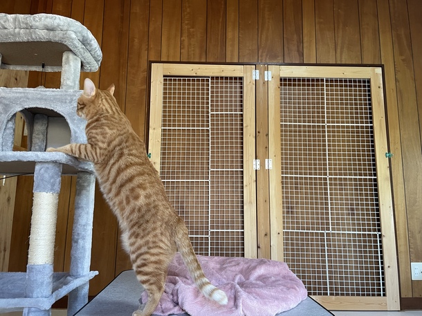 工事中に万が一がない様にと、隣の部屋のには4匹成猫さんがいますが、そのうちの1匹(ミッチー)がとびらの隙間から人や他の生き物がいると威嚇しちゃうので…笑