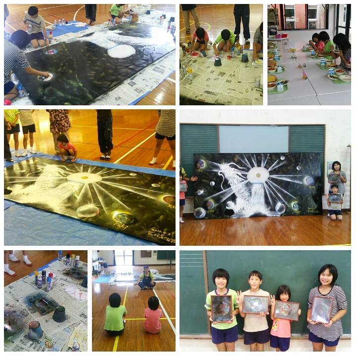 今日は全校児童4名の子どもたちと閉校喜念に取り組んだスプレーアート体験の画像をご覧ください。