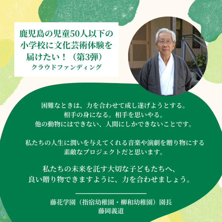 藤花学園(指宿幼稚園・柳和幼稚園)園長の藤岡様より素敵な応援メッセージをいただきましたのでご紹介させていただきます。