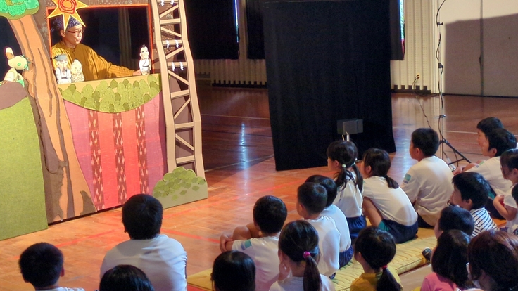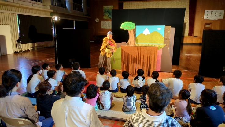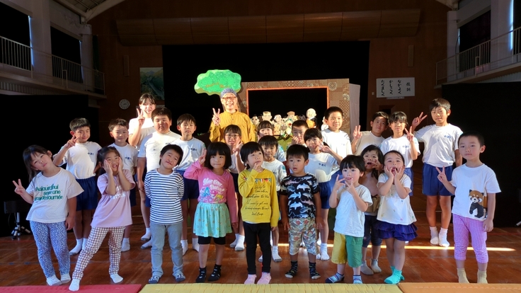 開演前に担当の先生が「今日初めて人形劇を見る人手を上げて」というと、子どもたち全員、そして子どもたちの後ろに座っていた地域のみなさん全員が手をあげました。