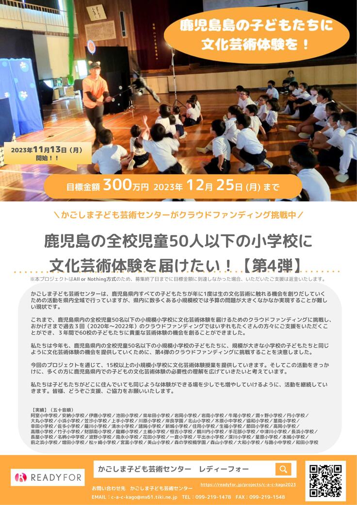 そんな思いでかごしま子ども芸術センターでは2020年からクラウドファンディングに挑戦し、2021年からそのクラウドファンドでみなさまからいただいたご支援で全校児童50名以下の小規模小学校での文化芸術体験支援を行う活動を続けています。