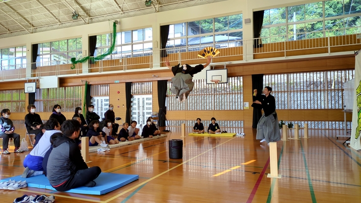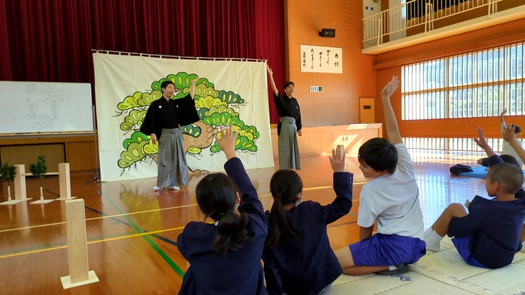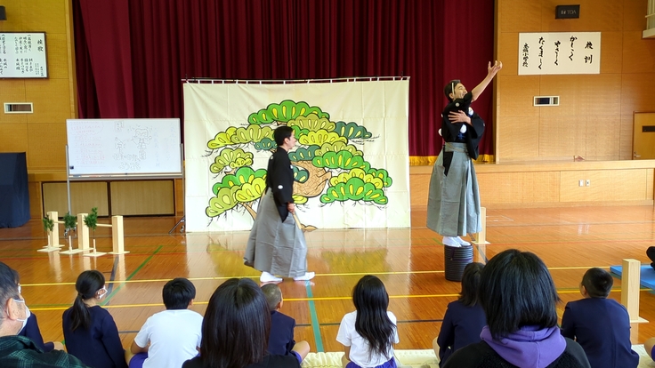 クラウドファンディングによる小規模小学校支援事業、今週は狂言大藏流吉次郎会の大藏孝義さんと上田圭輔さんによる狂言体験が3校実施されます。