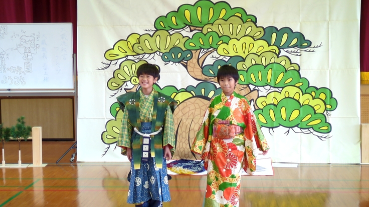 後半の体験では、代表(希望者のジャンケン)で衣装を着たり、立ち方、声の出し方、柿の食べ方などを体験しました。