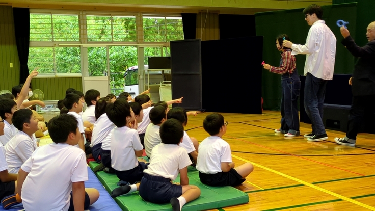 (写真は6月に支援公演で実施された志布志市立潤ヶ野小学校での演劇公演)