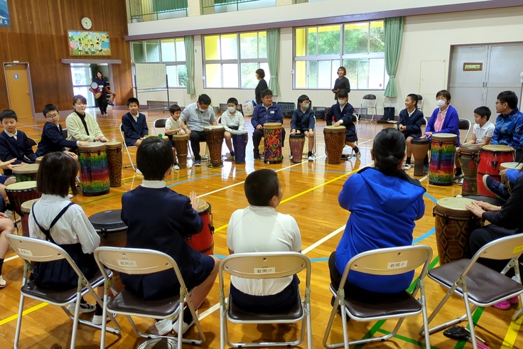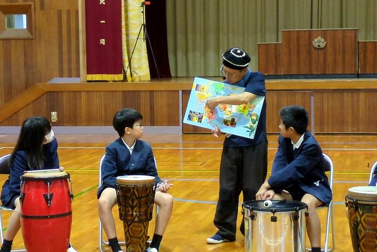 後半の席替えの後にはそれ楽器の歴史も教わり、サンボ、マンボなど楽器の産地のリズムをみんなで奏でました。