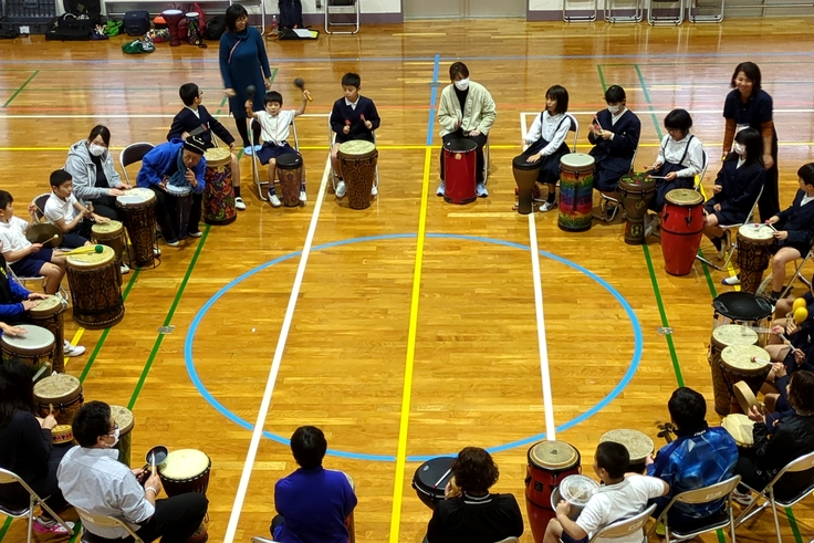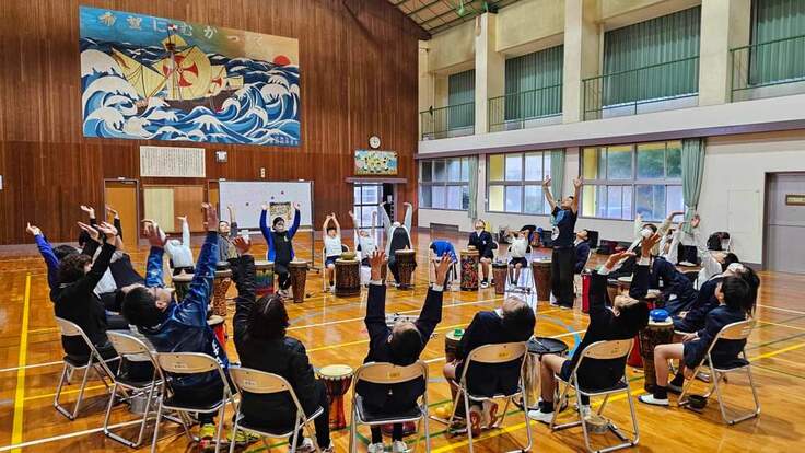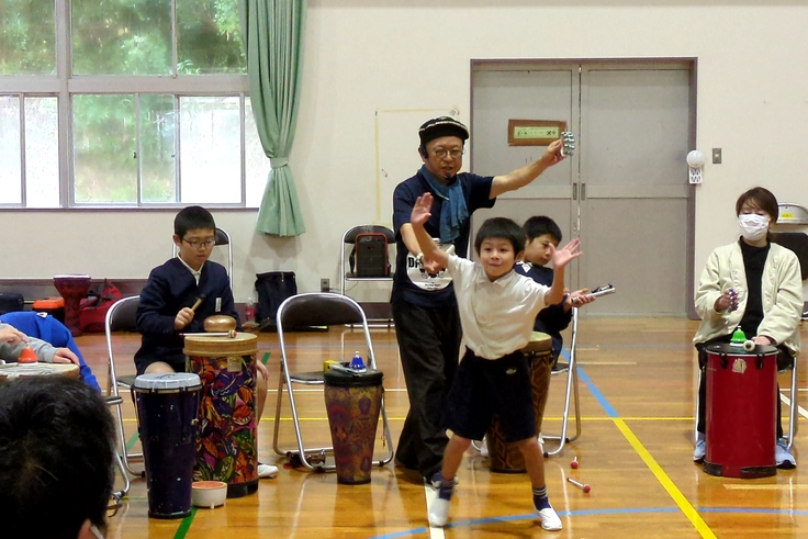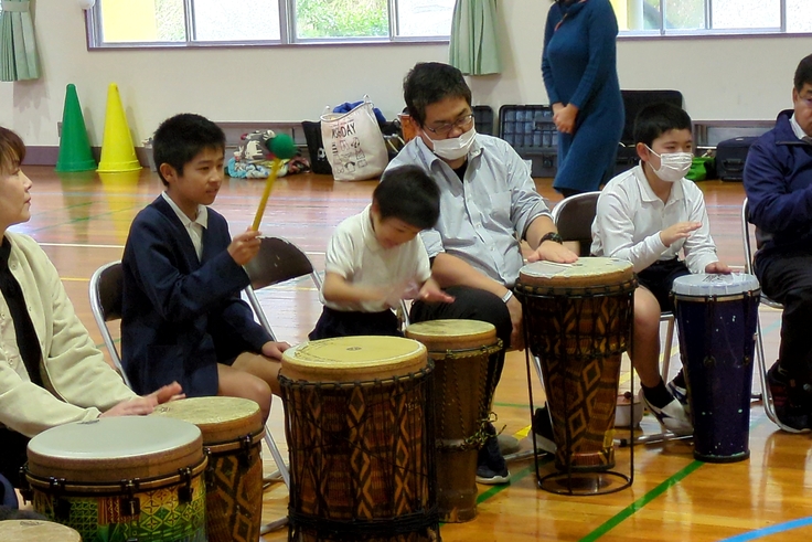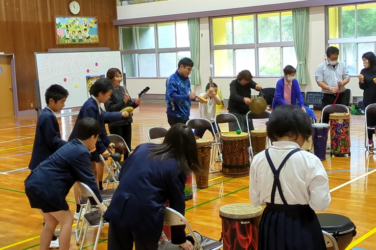 全校児童15名の中種子町立岩岡小学校で、リズムハートの森田孝一郎さん、藤田香織さんによるドラムサークル体験でした。