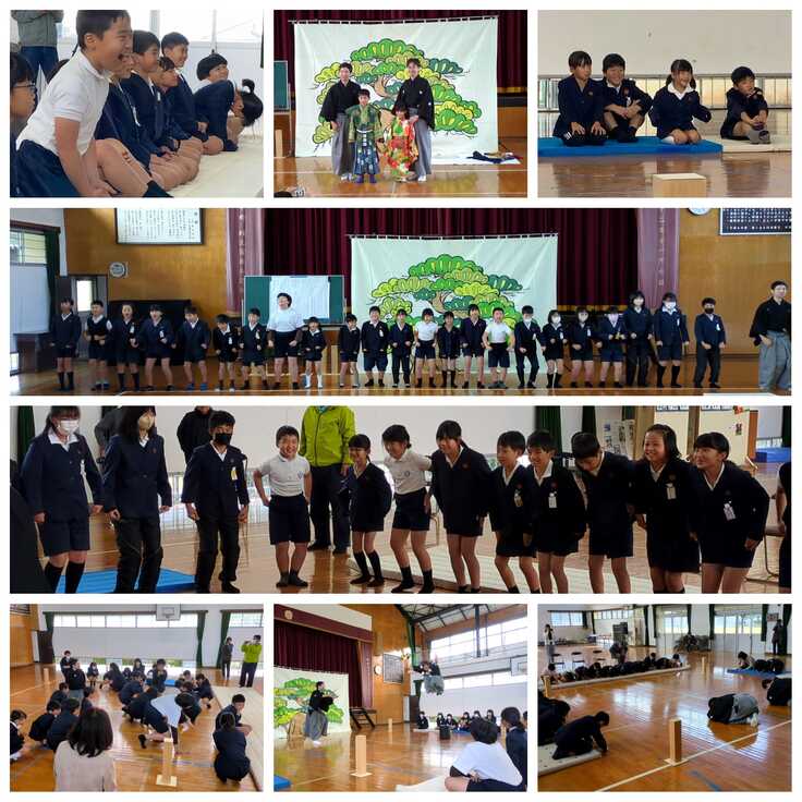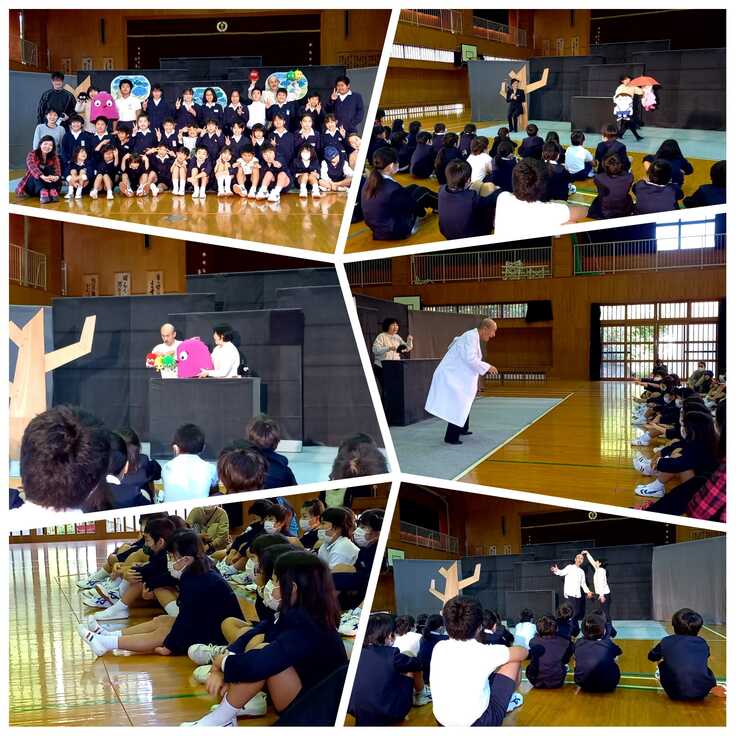 写真は過去に実施されたクラウド支援公演から、南大隅町立佐多小学校(全校児童32名:当時)での劇団さんぽ「まっくろネリノ/おじさんの傘」、肝付町立波野小学校(23名)での狂言大蔵流吉次郎会「狂言の鑑賞と体験」の様子です。
