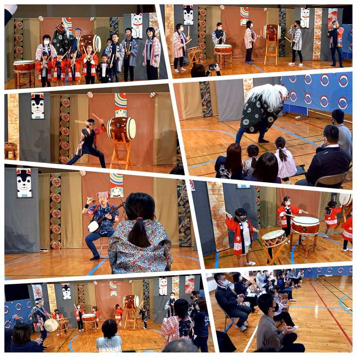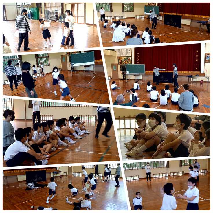写真は過去に実施されたクラウド支援公演から、曽於市立高岡小学校(全校児童5名:当時)でのただじゅん企画「おはやしげきじょうだだすこだんだん」、志布志市森山小学校(13名:当時)でのはせがわ天晴さんによる「パントマイム教室」の様子です。