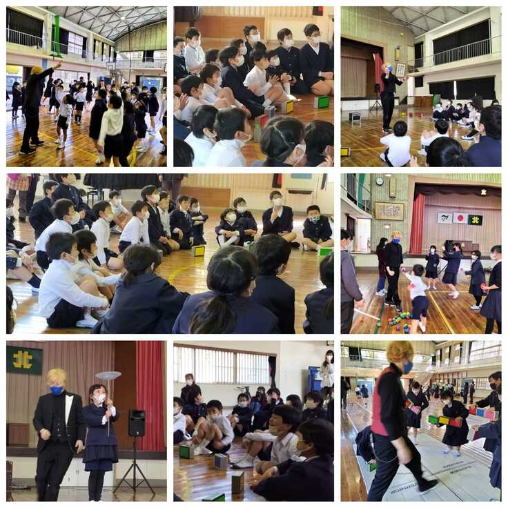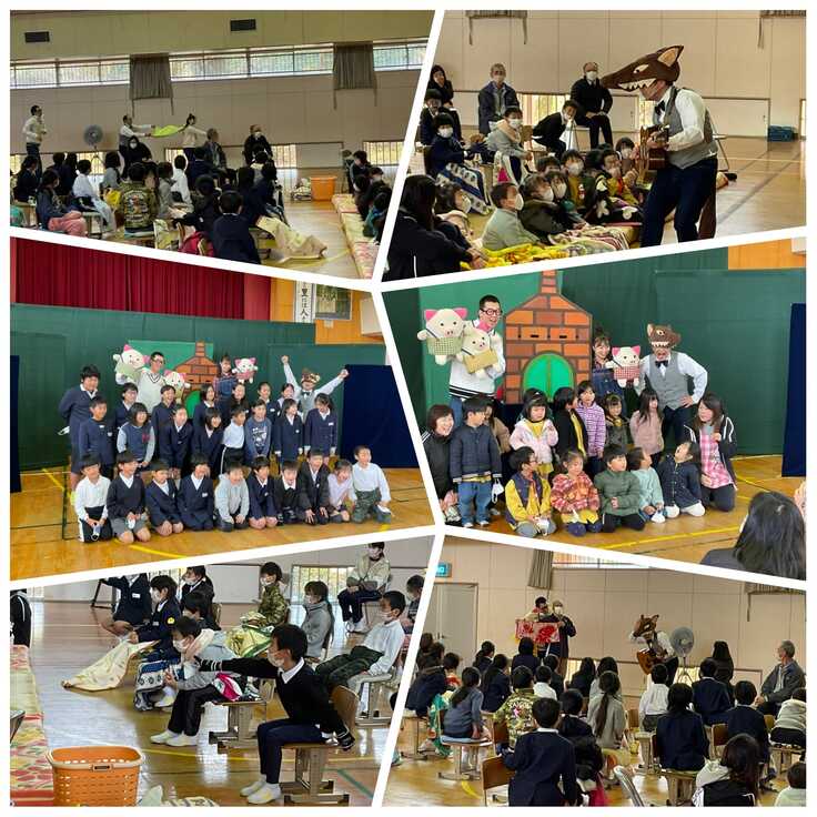 写真は過去に実施されたクラウド支援公演から、霧島市立竹子小学校(全校児童25名:当時)での劇団道化「3びきのコブタ」、姶良市立北山小学校(33名:当時)でのK@ITOさんによる「パフォーマンスショーとジャグリングワークショップ」の様子です。