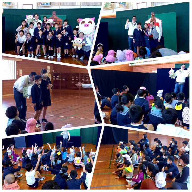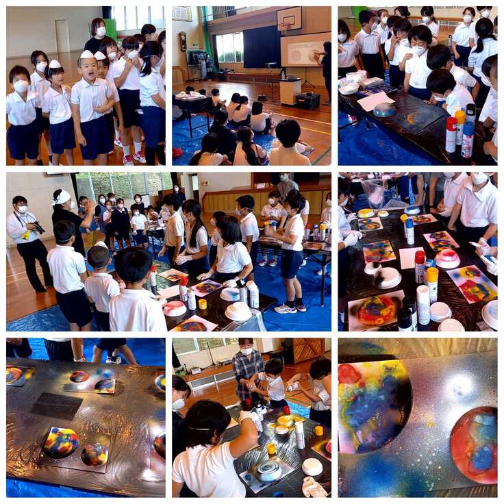 写真は過去に実施されたクラウド支援公演から、中種子立星原小学校(全校児童18名:当時)でのZAKさんによる「スプレーアート体験」、西之表市立安納小学校(12名:当時)での劇団道化さんによる「3びきのコブタ」の様子です。
