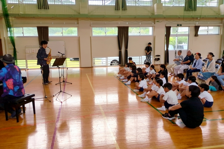 1曲目から体を揺らして楽しそうに曲を聴き、サクソフォンのソロによる島唄「行きゅんにゃ加那」ではサクソフォンから聞こえる波の音にびっくりしていました。