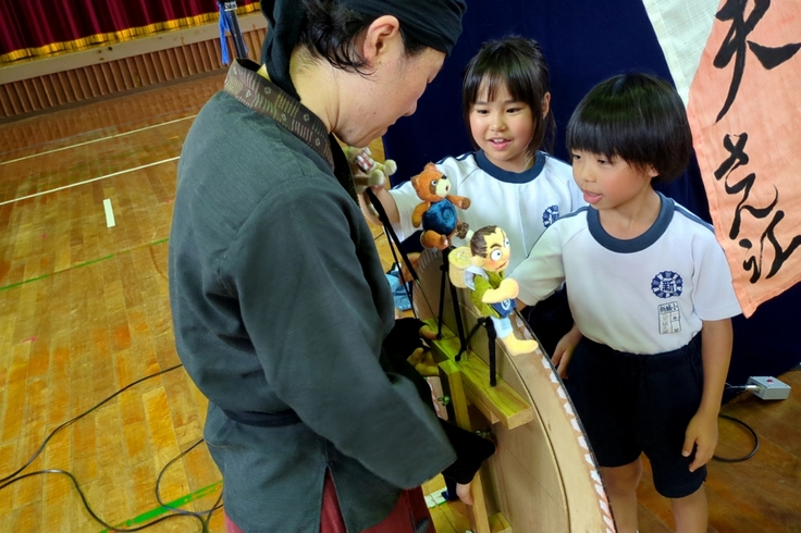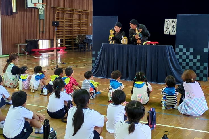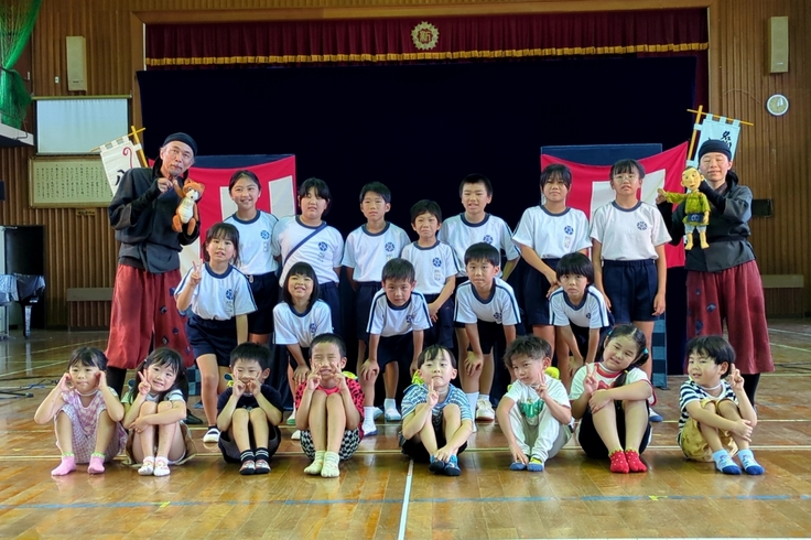小学校の児童と近くの子ども園の園児、合わせて20名の子どもたちと先生方が人形劇「まんてんげきじょう」を楽しみました。