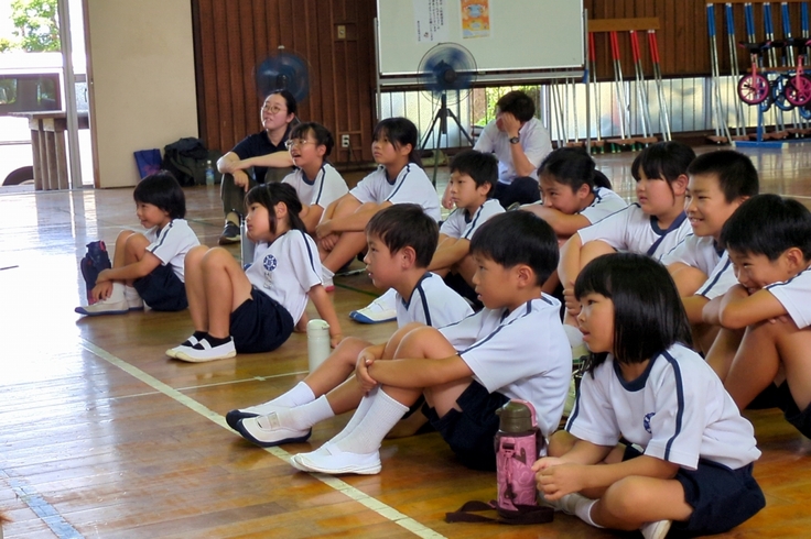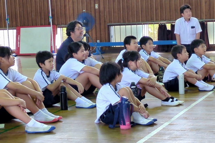 準備のときはかなりの暑さと湿度でしたが、子どもたちが入場する頃には体育館から校庭を挟んで見える海からの風が時折、涼を運んできてくれていました。