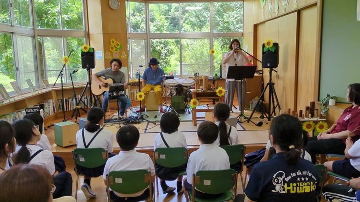 いつもは、静かな図書室がコンサート会場になり、図書の先生がヒマワリの飾り付けをして下さり、ヒマワリ畑のステージとなりました。