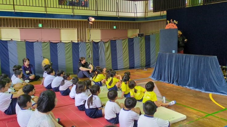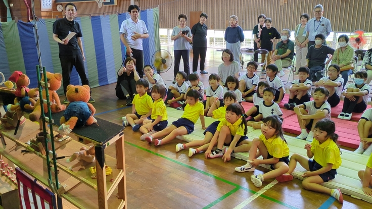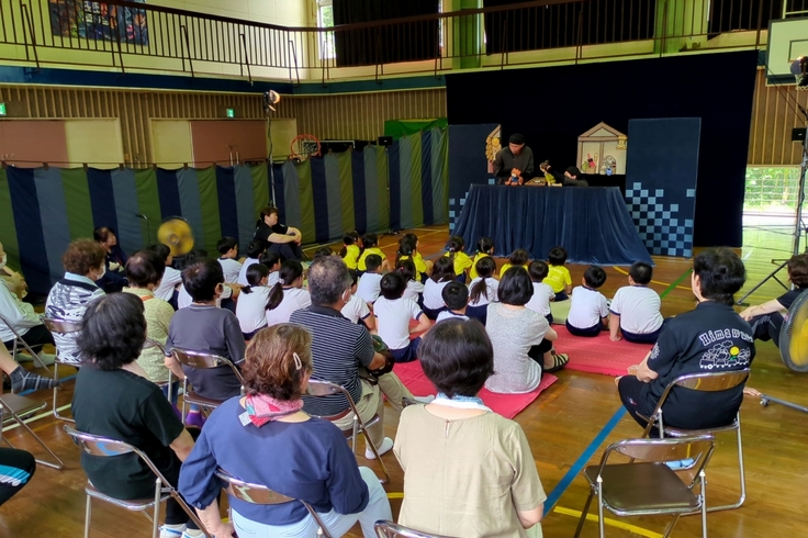 全校児童19人とこども園から8人の園児さんと4人の先生、事前に案内のチラシも配られたようで地域の方々も11人参加され、人形劇団京芸の「まんてんげきじょう」を楽しみました。