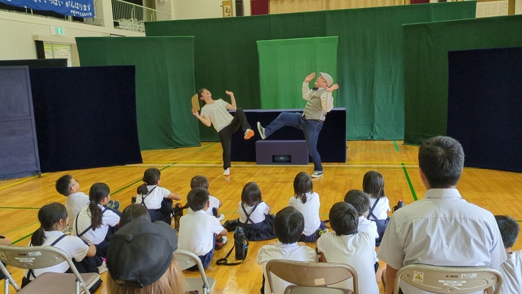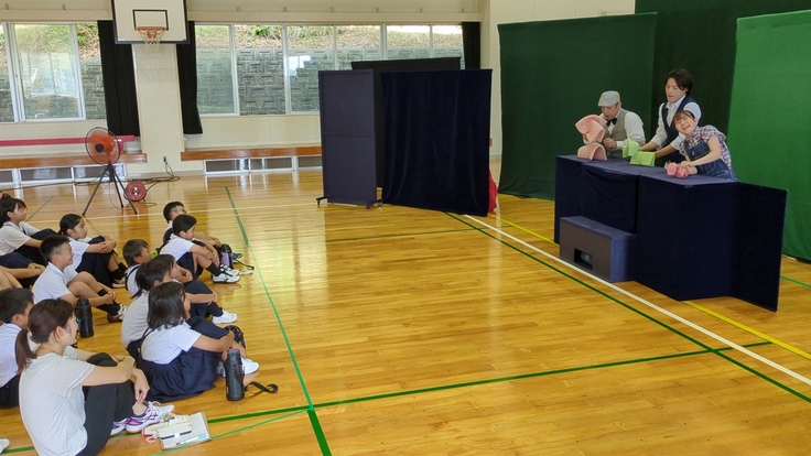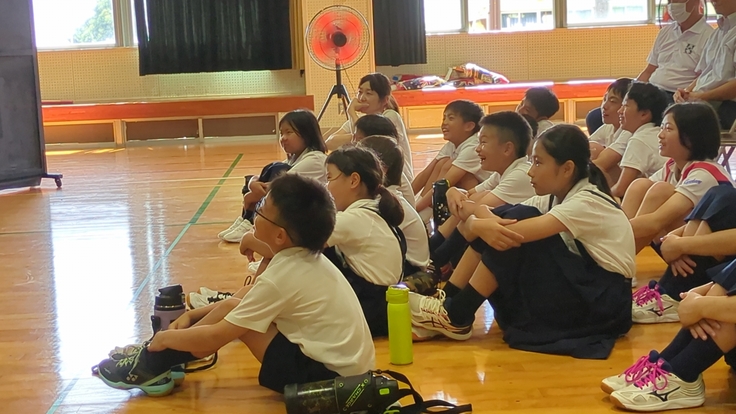 台風が近づいていて、運動会の準備で出されていたテントも折りたたまれているほどの強い風が時折吹いていたのですが、それでもとっても暑い体育館、子どもたちは一所懸命舞台を観ていました。