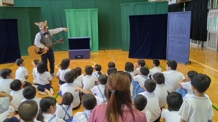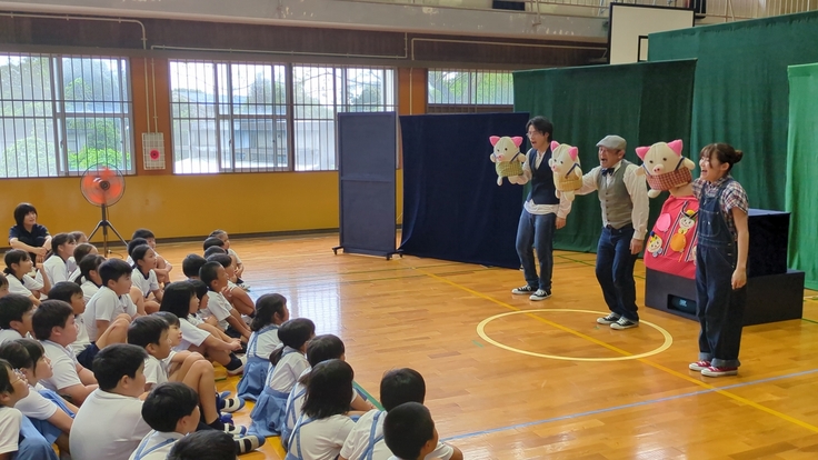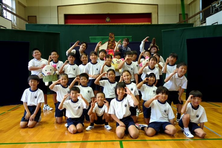 小規模小学校支援事業、今年度20校目は9月14日(土)、前日に続いての種子島公演でした。全校児童26名の上西小学校にお隣の全校児童25名の国上小学校の子どもたちも参加して、劇団道化さんの「なにができるかな」と「3びきのコブタ」を楽しみました。