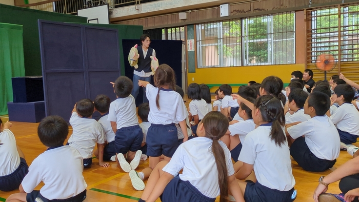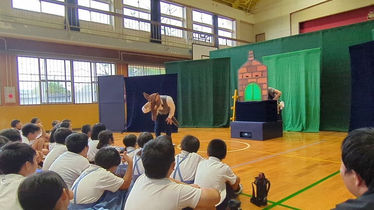 「3びきのコブタ」ではバッグの中からコブタが出てきて物語が始まるのですが、役者さんに「このバッグ、何が入っていると思う?」と聞かれた上西小の子どもたちは、教頭先生が来訪者対応でたまたまその場を離れていることに気づき、「教頭先生が入ってるー!」と声を上げていました。