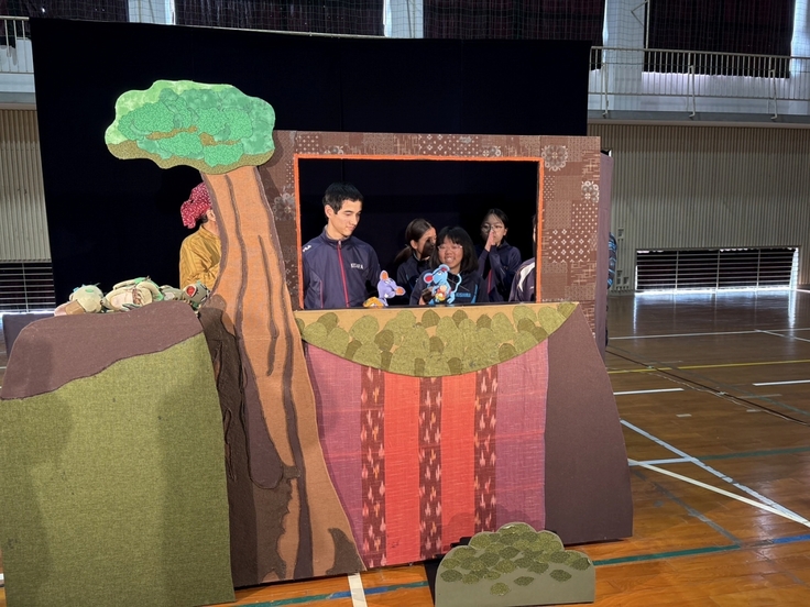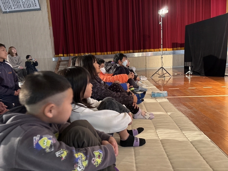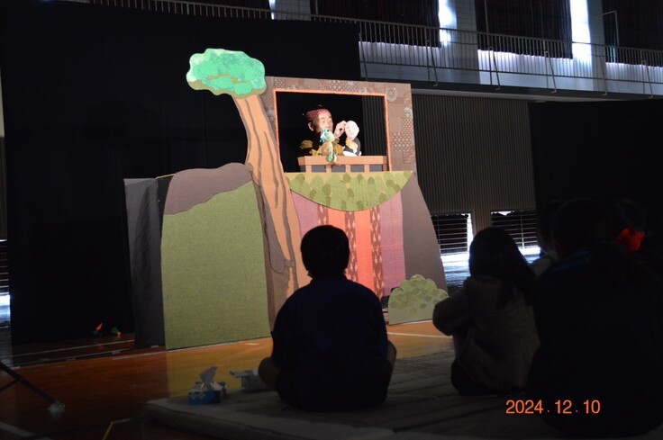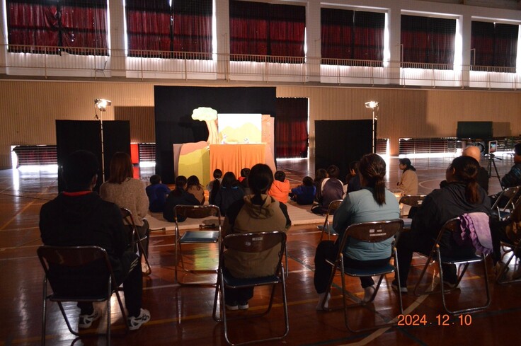 12月10日火曜日は、全校児童・生徒20名の肝付町立岸良学園で、人形芝居ひつじのカンパニーさんの「ねずみのすもうとカッパの雨乞い」の公演がありました。