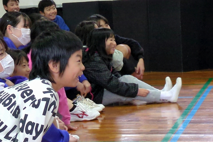 阿室小中学校でも子どもたちはとても楽しみに待っていてくれて、小学生は校舎から体育館まで走ってきて、ものすごく大きな声で「おはようございます!」と挨拶してくれました。