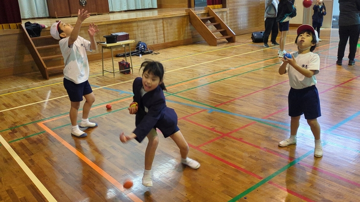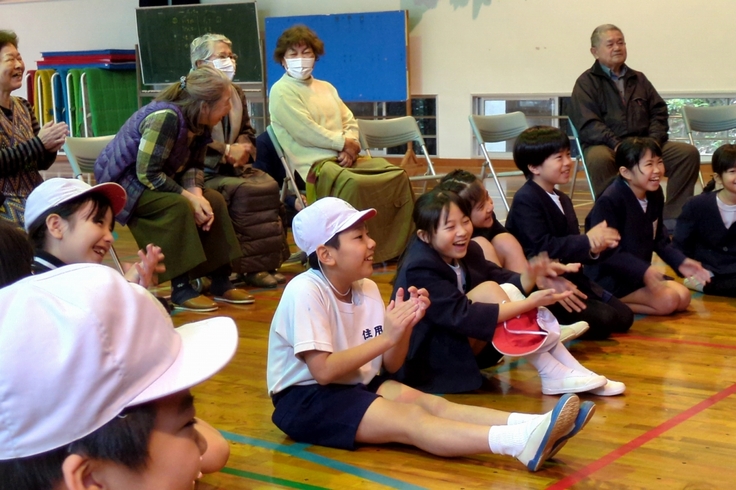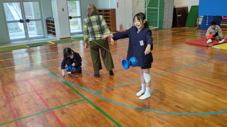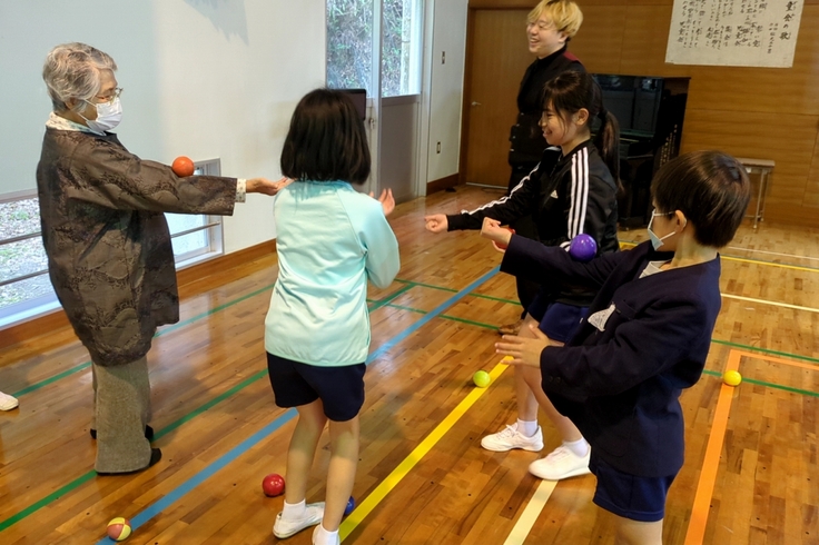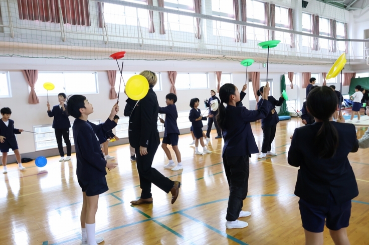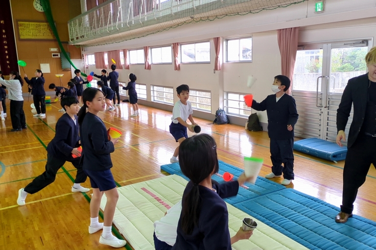 住用小学校では地域の方々もワークショップに参加され、時間いっぱい子どもたちと一緒に様々なジャグリングに挑戦されました!