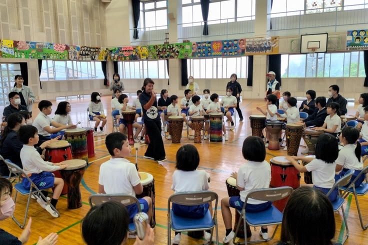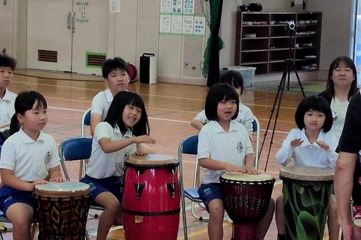 5月21日(水)今年度の1校目は全校児童42名の霧島市立霧島小学校でリズムハートのみなさんによるドラムサークル体験でした。