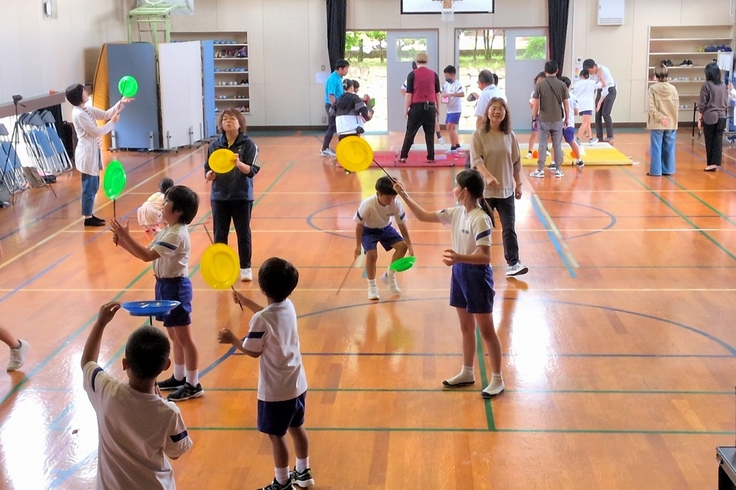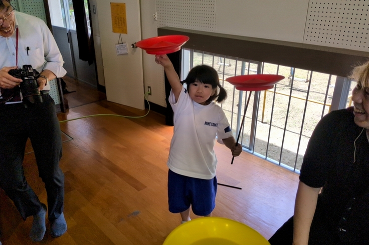 後半のジャグリングの体験では、子どもたちもお母様方も先生方も積極的にトライして、皿回しでは回せるようになった人何人もいてびっくりでした。