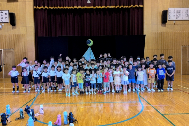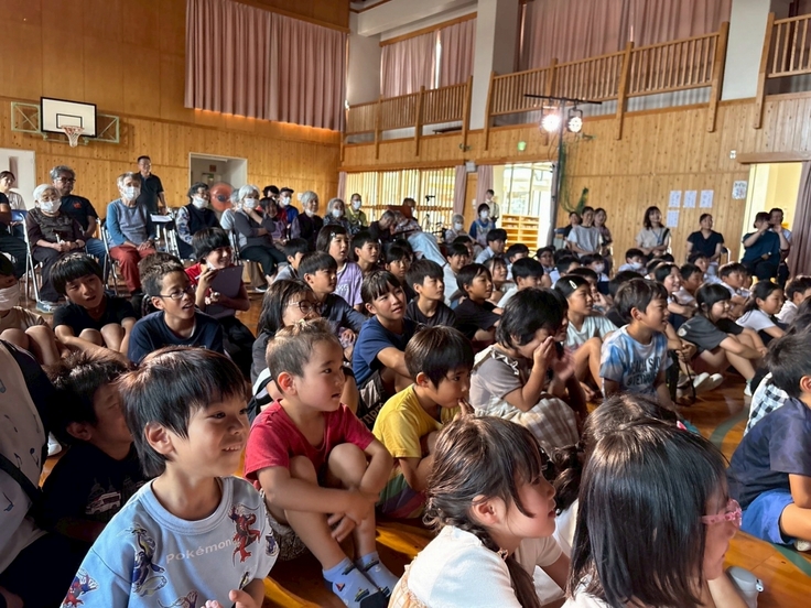 笠木小学校は全校児童38名の学校で、この日は周辺の大隅北小学校(34名)と菅牟田小学校(14名)、そして保育園の子どもたち10名や地域の方々も参加されて賑やかな鑑賞会になりました。