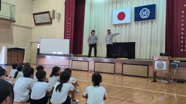 10月15日(水)は全校児童34名の鹿屋市立祓川小学校ではせがわ天晴さんと坪内晋二さんによる「パントマイム体験」が行われました。