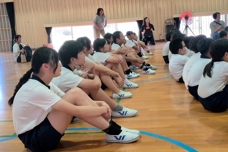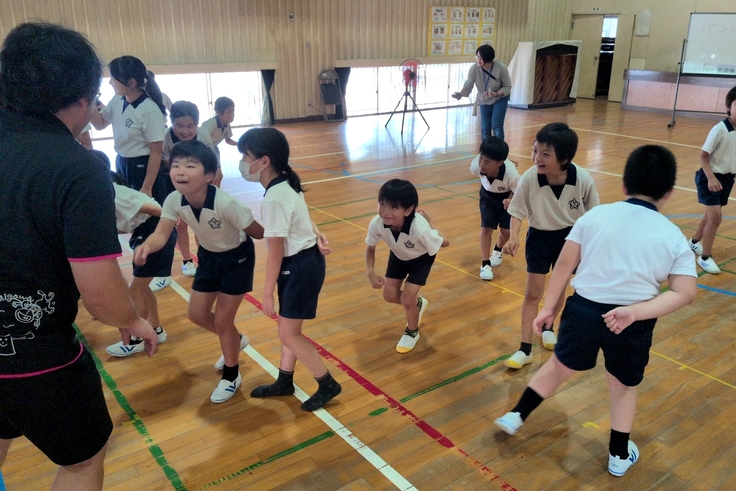 体験になると、ちょっと恥ずかしそうでしたが、先生方もいっしょに参加してくださったので、体育館をいっぱいに使って動いていました。