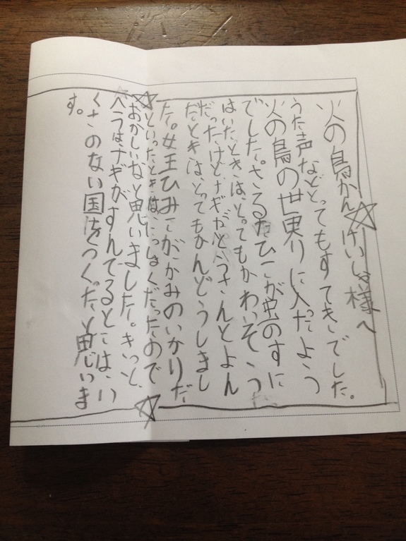 昨日、千葉中央おやこ劇場の事務所に届いた招待した子どもたちからのメッセージです。休憩時間に声をかけたら、すごく楽しんでいる様子で、終演後に出演した人形たちがロビーで待っていることも伝えたら大喜びだったので、最後まで楽しんでもらえたようです。頂いたエッセージひとつひとつに私達が力を貰っています。